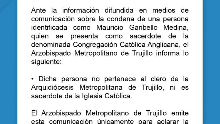 Ante la información difundida en medios de comunicación sobre la condena de una persona identificada como Mauricio Garibello Medina, quien se presenta como sacerdote de la denominada Congregación Católica Anglicana, el Arzobispado Metropolitano de Trujillo informa lo siguiente: • Dicha persona no pertenece al clero de la Arquidiócesis Metropolitana de Trujillo, ni es sacerdote de…