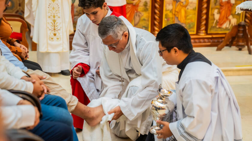 Mons. Alfredo Vizcarra, S. J., lavó los pies a doce fieles durante la misa de “la Cena del Señor” en la Basílica Catedral.